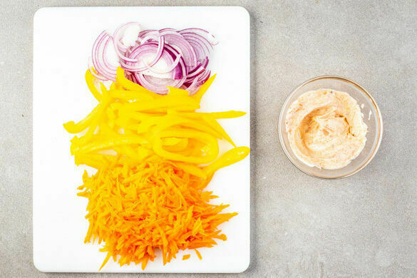Die Karotte ggf. schälen, grob raspeln und mit 1EL hellem Essig, ½TL Honig oder Zucker sowie je 1 Prise Salz und Pfeffer vermengen. Die Zwiebel schälen, halbieren und in feine Streifen schneiden. 4EL Mayonnaise mit der Gewürzmischung und je 1 kräftigen Prise Salz und Pfeffer zu einem Dip verrühren.