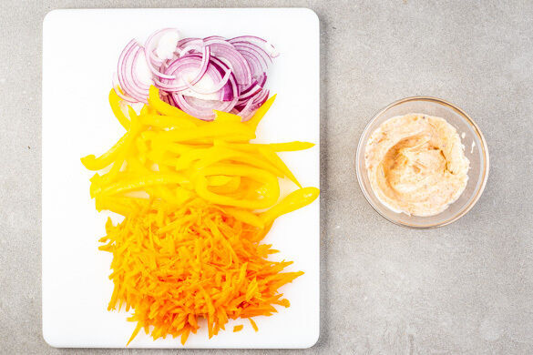 Die Karotte ggf. schälen, grob raspeln und mit 1EL hellem Essig, ½TL Honig oder Zucker sowie je 1 Prise Salz und Pfeffer vermengen. Die Zwiebel schälen, halbieren und in feine Streifen schneiden. 2EL Mayonnaise mit der ½ der Gewürzmischung und je 1 Prise Salz und Pfeffer zu einem Dip verrühren.
