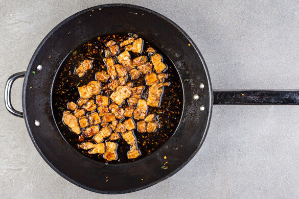 Die Sojasauce und 1EL hellen Essig mit 3EL Zucker und 2EL Wasser in die Pfanne rühren und zum Kochen bringen. Die Hitze reduzieren und bei mittlerer bis niedriger Hitze abgedeckt 10–12Min. köcheln lassen, bis das Fleisch zart und gar ist.
