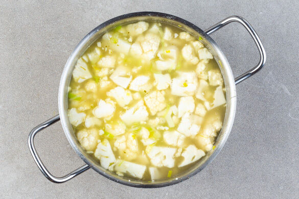 Die weißen Lauchstreifen in einem großen Topf mit 2EL Olivenöl und 1 kräftigen Prise Salz bei mittlerer Hitze 2–3Min. farblos anbraten. Den Blumenkohl zugeben, mit dem heißen Wasser ablöschen und 1 Prise Gewürzmischung sowie das Brühgewürz unterrühren. Die Suppe einmal aufkochen lassen und ca. 10Min. abgedeckt köcheln lassen, bis der Blumenkohl gar ist.
