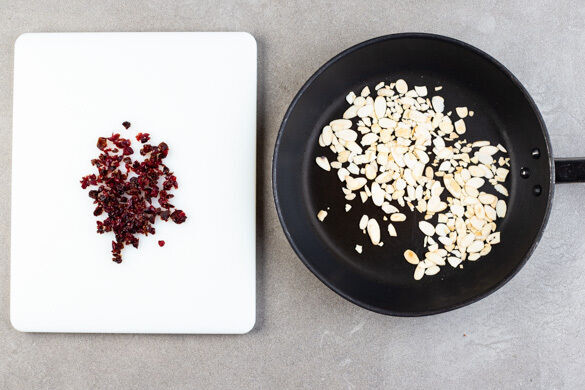 Die Mandeln in einer kleinen Pfanne ohne Zugabe von Fett bei mittlerer Hitze 1–2Min. goldbraun anrösten. Vorsicht, sie können schnell zu dunkel werden. Zum Abkühlen aus der Pfanne nehmen und beiseitestellen. Die Cranberrys in ein Sieb abgießen und grob schneiden.