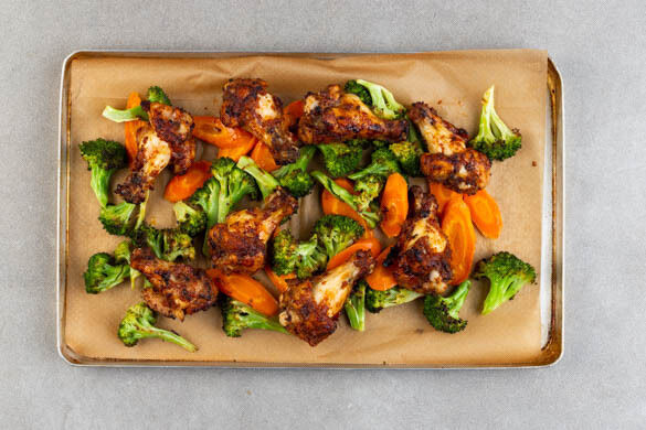 Den Brokkoli samt Strunk in mundgerechte Stücke schneiden. Die Karotte ggf. schälen und in ca. 0,5cm dünne Scheiben schneiden. Die Zwiebel schälen und in ca. 1cm dicke Spalten schneiden. Alles auf einem mit Backpapier ausgelegten Backblech mit 1EL Pflanzenöl, ½TL Salz und 1 kräftigen Prise Pfeffer vermengen. Das Fleisch auf das Gemüse legen und alles 20–25Min. im Ofen backen.