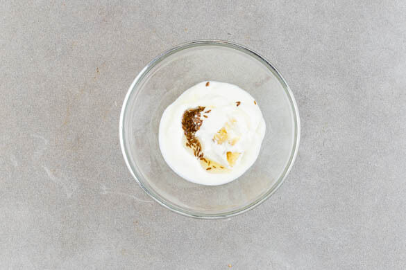 Den Knoblauch schälen und sehr fein würfeln oder durch eine Knoblauchpresse drücken, dann in einer kleinen Pfanne mit 1EL Pflanzenöl bei mittlerer Hitze ca. 30Sek. anrösten, bis er zu bräunen beginnt. In eine hitzebeständige Schüssel geben, die ½ der Minze und den Joghurt hinzufügen und mit Salz und Pfeffer abschmecken.