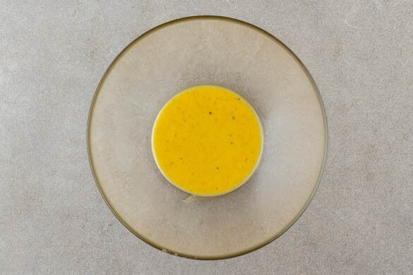 In einer Salatschüssel 2EL Olivenöl mit 1EL Essig, 2TL Senf und 2TL Honig verrühren und die Vinaigrette mit je 1 kräftigen Prise Salz und Pfeffer würzen.