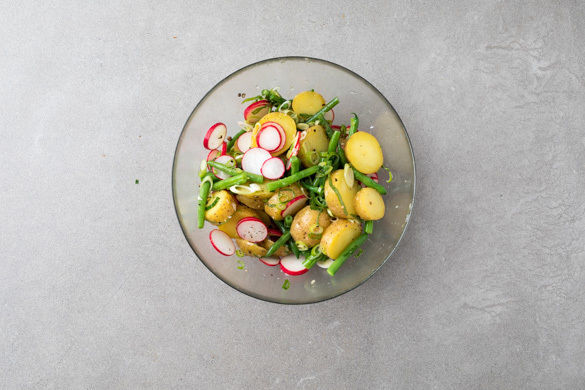 Die Enden der Bohnen entfernen, die Bohnen in das kochende Wasser geben und in 7–8Min. bissfest kochen. Nach Ende der Garzeiten die Kartoffeln und die Bohnen abgießen und auskühlen lassen.