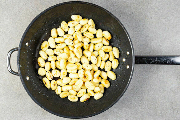 Die Gnocchi in einer zweiten großen Pfanne mit 2EL Olivenöl bei mittlerer bis starker Hitze 6–8Min. braten, dabei ab und zu umrühren. Mit je 1 kräftigen Prise Salz und Pfeffer würzen.