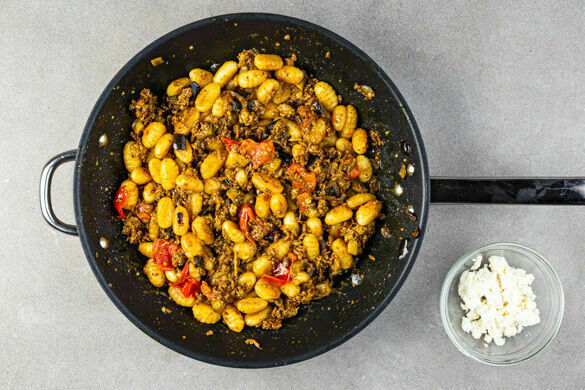 Wer sich schon beim Anblick dieser wunderbaren Kombination aus Gnocchi, Aubergine und Fetakäse die Lippen leckt, muss nicht lange warten: Die reichhaltige Sauce mit Bio-Rinderhack gelingt dir im Handumdrehen und nebenbei kannst du ganz entspannt das leckere Pesto aus Feta, ordentlich Knofi und frischem Basilikum mit Za’atar-Gewürzen zubereiten. Und dann: Einen kleinen Klacks Pesto obendrauf – ein großes Mmmmmh aus deinem Mund!
