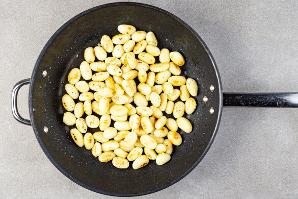 Die Gnocchi in einer zweiten großen Pfanne mit 1EL Olivenöl bei mittlerer bis starker Hitze 6–8Min. braten, dabei ab und zu umrühren. Mit je 1 kräftigen Prise Salz und Pfeffer würzen.