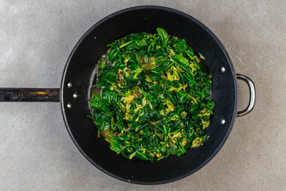 Die Zucchini, den Knoblauch und 1 Prise Chiliflocken zu den Sardellen in die Pfanne geben und alles 3–5Min. braten, bis die Zucchini gar ist. Dann den Spinat nach und nach zugeben und zusammenfallen lassen. Mit Salz und Pfeffer sowie den restlichen Chiliflocken nach Geschmack würzen. Vorsicht, die Chiliflocken sind sehr scharf.