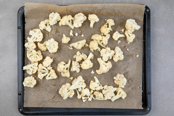 Den Backofen auf 240°C (220°C Umluft) vorheizen. Den Blumenkohl in 2–3cm große Röschen schneiden.