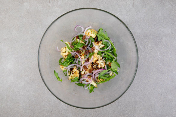Die eingeweichten Zwiebeln und Rosinen in ein Sieb abgießen. Die Zitronenschale abreiben, dann die Zitrone halbieren und auspressen. 3EL Olivenöl, 3EL Zitronensaft, 1TL Zitronenschale und je 1 kräftige Prise Salz und Pfeffer zu einem Dressing verrühren und mit dem Blumenkohl, den Zwiebeln, den Rosinen und dem Rucola in einer großen Schüssel vermengen.