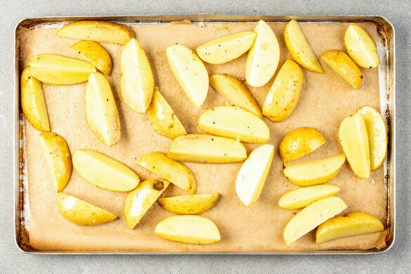 Den Backofen auf 220°C (200°C Umluft) vorheizen. Die Kartoffeln samt Schale in ca. 2cm breite Spalten schneiden, auf einem mit Backpapier ausgelegten Backblech mit 4EL Olivenöl sowie je 1 kräftigen Prise Salz und Pfeffer vermengen und in 20–25Min. im Ofen goldbraun backen. Nach der Hälfte der Zeit die Position der Bleche tauschen.