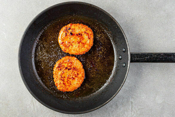 Die Paprika und die Pilze in der heißen Grillpfanne oder auf dem Grill auf jeder Seite 4–5Min. kräftig anrösten. Beiseitestellen. Die Pattys rundum mit 2TL Olivenöl bepinseln und in der Grillpfanne bzw. auf dem Grill auf jeder Seite 2–3Min. grillen.
