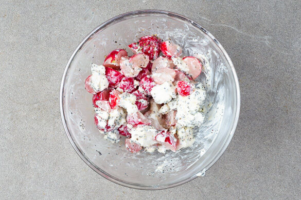 Den Käse mit den Fingern oder einer Gabel sehr grob zerkrümeln und mit den Radieschen, 2TL Olivenöl, 2TL Essig, der ½ des Blaumohns und je 1 Prise Salz und Pfeffer vermengen.
