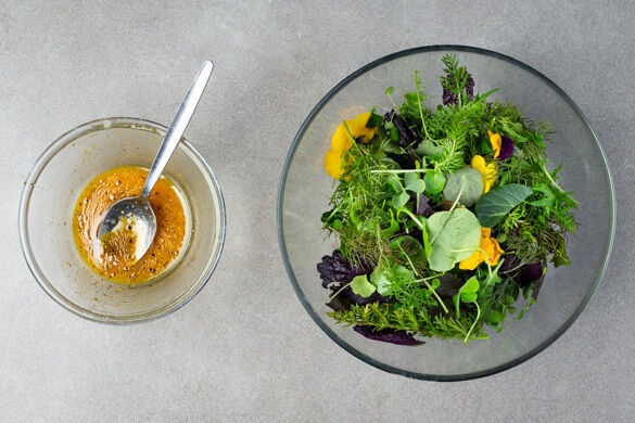 1TL Olivenöl, 1TL Essig, 1TL Senf und 1TL Honig zu einem Dressing verrühren, mit Salz und Pfeffer abschmecken und mit dem Wildkräutersalat vermengen. Die Zucchini-Crêpes mit den Wildkräutern und dem Ziegenkäse-Radieschen-Salat garniert servieren.