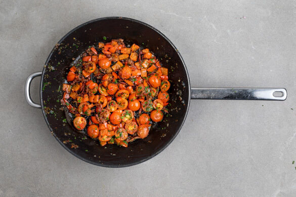 Die Paprika, die Schalotten, die Peperoni nach Geschmack und die Petersilienstängel in der Pfanne mit 1EL Olivenöl bei mittlerer Hitze ca. 1Min. anbraten. Den restlichen Schinken, die Tomaten, den Knoblauch und ca. ⅔ der restlichen Petersilie mit etwas Pastawasser dazugeben und unter Rühren 4–5Min. weiterbraten, bis das Gemüse gar ist.