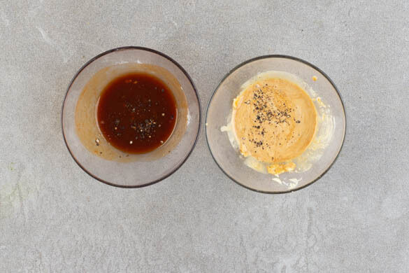 Die BBQ-Sauce mit der ½ der Sojasauce, 1TL Honig, 1TL Mehl, 1EL Wasser und 1 Prise Pfeffer zu einer Würzsauce verrühren. Den Knoblauch schälen, fein würfeln und mit der restlichen Sojasauce, 1EL Mayonnaise und 1 Prise Pfeffer zu einem Dressing verrühren.