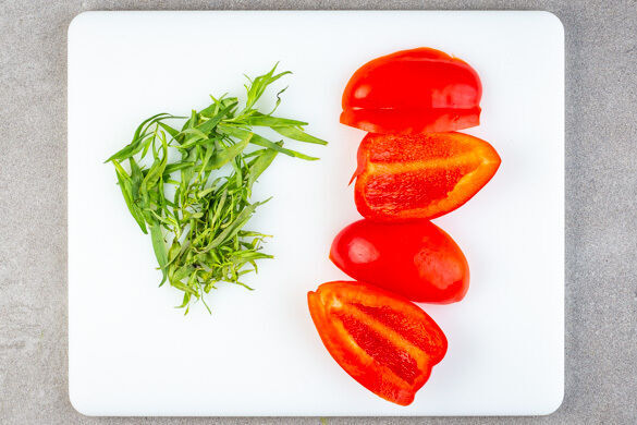 Die Paprika vierteln und entkernen. 1EL Butter beiseitestellen und Raumtemperatur annehmen lassen. Die ½ der Estragonblätter von den Stängeln zupfen. Der übrige Estragon wird für dieses Rezept nicht benötigt.