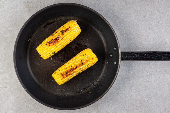 Die gebratene Paprika in die Pfanne mit den Würsten geben, vom Herd nehmen und abgedeckt warm halten. Den Mais in die leere Pfanne geben und bei mittlerer Hitze in 10–12Min. rundum goldbraun braten. Den Mais zum Warmhalten in die Pfanne zu der Paprika und den Würsten geben.