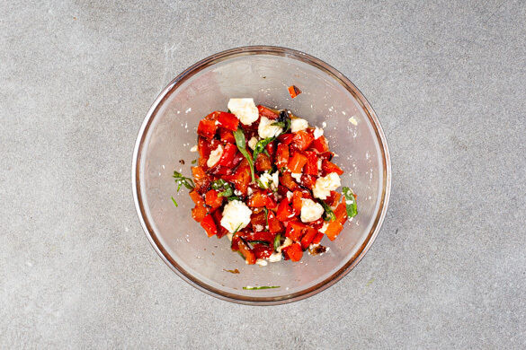 Die Paprika aus der Pfanne nehmen, in kleine Würfel schneiden und mit dem restlichen abgezupften Estragon, 1EL Essig, 1EL Zucker und ½TL Salz vermengen. Die ½ des Fetas über dem Relish zerkrümeln. Mit Salz und Pfeffer abschmecken.