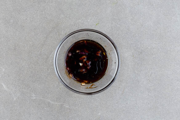 Aus 1EL Zwiebeln, 1EL Olivenöl, der Balsamicocreme, 1EL Wasser und 1 Prise Zucker ein Dressing anrühren und kräftig mit Salz und Pfeffer abschmecken.