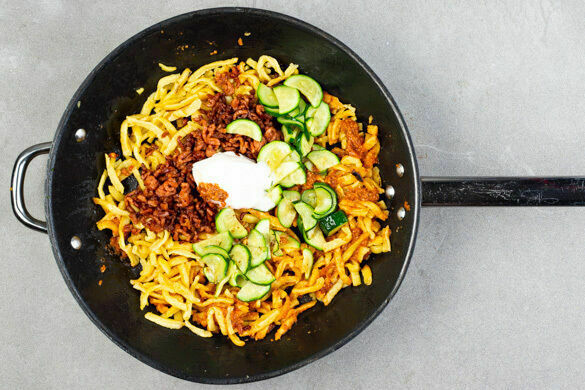 Weißt du, was ein Express-Wohlfühlgericht ist? Wenn nicht, dann wirst du heute eins kennenlernen: Zucchini und saftiges Rinderhack werden flugs angebraten, mit frischen Spätzle vereint und mit einem edlen Pesto aus Oliven und getrockneten Tomaten verfeinert. Zum Schluss verleihst du der Kreation noch einen cremigen Touch und schon steht alles auf dem Tisch – schneller, als du „Express-Wohlfühlgericht“ sagen kannst!