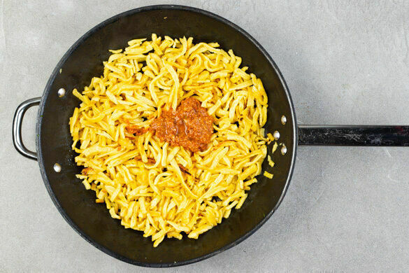 Das Pesto zu den Spätzle in die Pfanne geben, die Pestobecher mit etwas warmem Wasser ausschwenken und das Wasser ebenfalls zu den Spätzle in die Pfanne geben. Alles gut vermengen und 1–2Min. durchwärmen.