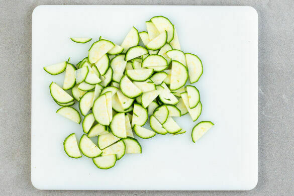 Die Zucchini längs halbieren und quer in dünne Scheiben schneiden.