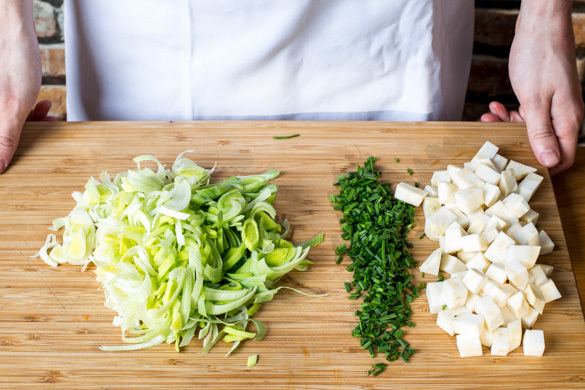 Den Sellerie vierteln und mit dem Messer schälen, dann in 1–2cm große Würfel schneiden. Die Zwiebeln schälen, halbieren und fein würfeln. Den Schnittlauch in kleine Röllchen schneiden.