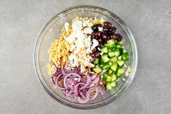 Den Greek White mit den Fingern oder einer Gabel zerkrümeln. Die Gurke in kleine Würfel schneiden und vorsichtig mit dem Greek White, den Risoni, den Zwiebelstreifen, den Oliven, 2EL Essig, je ½TL Salz und Pfeffer sowie der Bratensauce vermengen. Das Fleisch in Tranchen schneiden und auf dem Salat anrichten. Mit der Salsa garniert servieren.