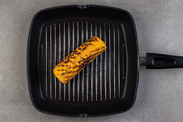 Eine Grillpfanne ohne Zugabe von Fett hoch erhitzen. Den Maiskolben in die heiße Pfanne legen, mit je 1 Prise Salz und Pfeffer würzen und ca. 5Min. grillen, bis der Mais stellenweise gebräunt ist, dabei gelegentlich wenden. Den Mais aus der Pfanne nehmen und auf einem Teller etwas abkühlen lassen, dann mit einem scharfen Messer vom Kolben schneiden. Die Pfanne aufbewahren.