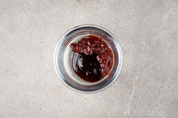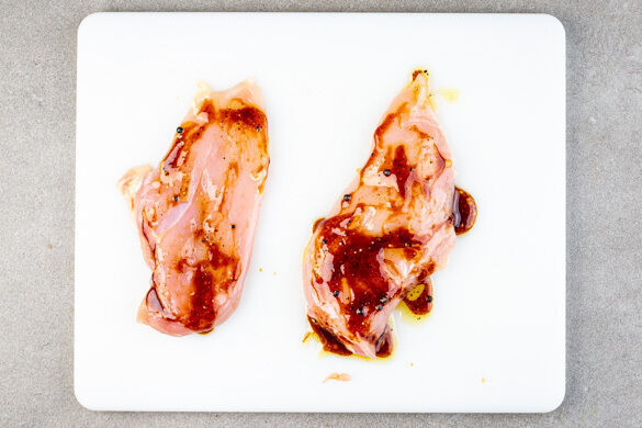Das Fleisch trocken tupfen und horizontal zu 2 dünneren Filets halbieren. 1EL Olivenöl, 1EL hellen Essig, die 1/2 der BBQ-Sauce sowie je 1 Prise Salz und Pfeffer zu einer Würzsauce vermengen und das Fleisch damit einreiben.