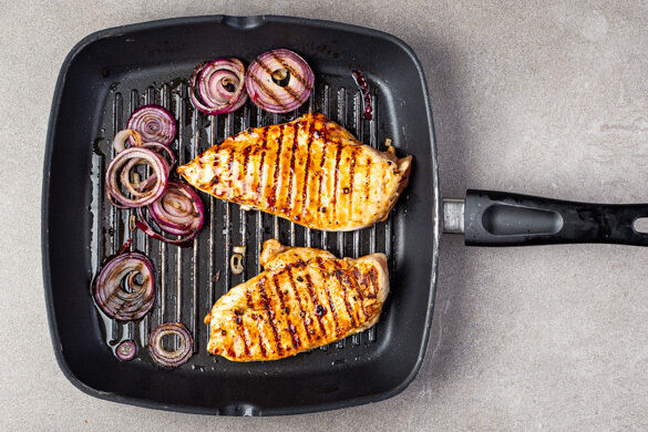 Die Grillpfanne ohne Zugabe von Fett mittelhoch erhitzen, das Fleisch in die heiße Pfanne geben und auf jeder Seite 3–4Min. grillen. Die Zwiebelringe 4–5Min. mitgrillen, bis sie weich sind, dabei gelegentlich wenden. Das Fleisch und die Zwiebeln auf einem Teller beiseitestellen.