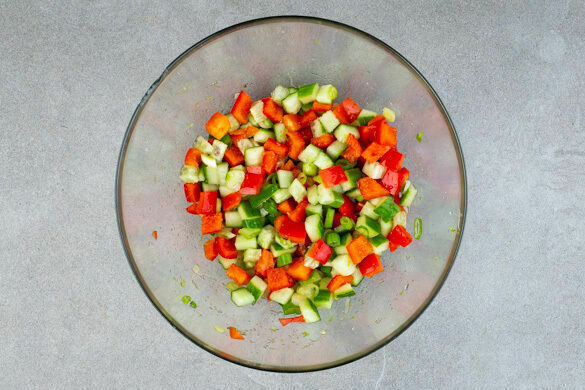 Die Paprika vierteln, entkernen und in kleine Würfel schneiden. Die Gurke ebenfalls in kleine Würfel schneiden. Die Lauchzwiebeln in dünne Ringe schneiden. Die Limettenschalen abreiben und die Limetten auspressen. Die Paprika, die Gurken und die Lauchzwiebeln mit 4EL Limettensaft, 2TL Limettenschale, 4TL Zucker und 1TL Salz vermengen und ziehen lassen.