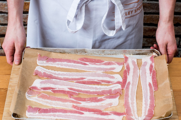 Währenddessen den Bacon auf einem mit Backpapier belegten Backblech auslegen und im Ofen in 8–10Min. kross werden lassen.
