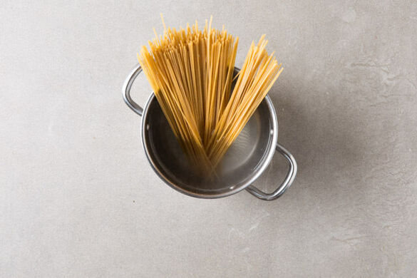 Die Pasta in das kochende Wasser geben und in 8–10Min. bissfest kochen. Mit einer Tasse etwas Pastawasser abschöpfen, dann die Pasta in ein Sieb abgießen und abtropfen lassen. Die Pasta im Sieb z. B. mit einem Teller abdecken, damit sie nicht auskühlt. Den Topf aufbewahren.