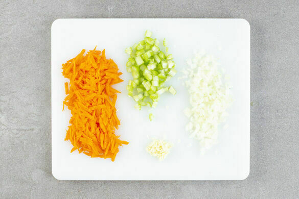 Die Karotten ggf. schälen und grob reiben. Den Sellerie längs halbieren und in kleine Würfel schneiden. Die Zwiebeln und den Knoblauch schälen und fein würfeln.