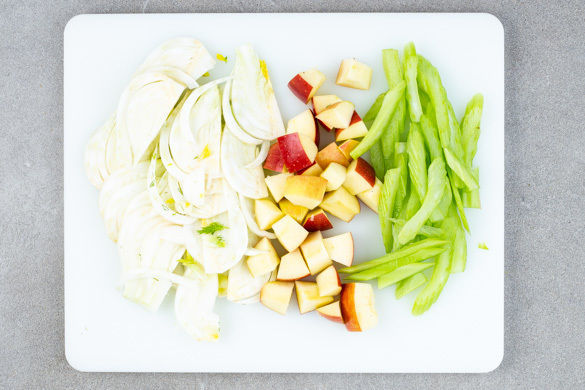 Den Backofen auf 180°C Umluft (200°C Ober-/Unterhitze) vorheizen. In einem mittelgroßen Topf ausreichend Wasser für das Fleisch zum Kochen bringen. Den Apfel halbieren und in ca. 2cm große Stücke schneiden, dabei das Kerngehäuse entfernen. Den Sellerie schräg in dünne Scheiben schneiden. Den Fenchel halbieren, den Strunk entfernen und den Fenchel in feine Streifen schneiden.