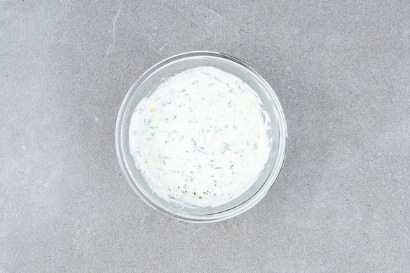 Die Petersilie abzupfen und fein hacken. Den Schnittlauch in Röllchen schneiden. Die 1/2 der Kräuter mit dem Joghurt, 1–2TL (hellem) Essig und 1–2EL Olivenöl zu einem Dressing verrühren und mit Salz und Pfeffer würzen.