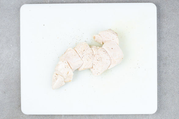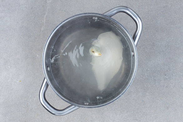 Den Knoblauch schälen und 2–3Min. in das kochende Wasser geben. Das Fleisch trocken tupfen, hinzugeben und ca. 3Min. mitkochen. Dann bei niedriger Hitze abgedeckt noch 12–14Min. ziehen lassen, bis das Fleisch gar ist. In ein Sieb abgießen und beiseitestellen.