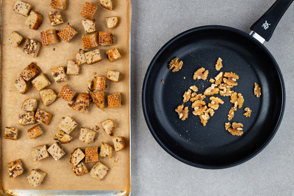 Inzwischen die Walnüsse in einer kleinen Pfanne ohne Zugabe von Fett bei mittlerer Hitze 3–4Min. anrösten. Vom Herd nehmen und beiseitestellen. Die Mehrkornstangen in 1–2cm große Stücke schneiden oder zupfen und mit 1–2EL Olivenöl sowie Salz und Pfeffer vermengen. Auf einem Backblech verteilen und im Ofen 8–10Min. rösten, bis die Croûtons knusprig sind.