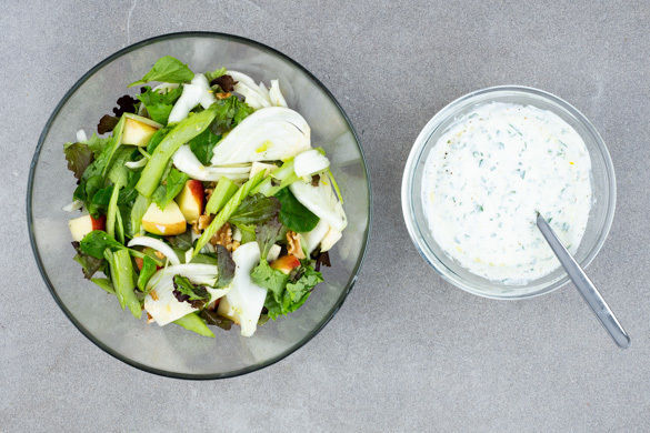 Heute haben wir für dich einen Salat aus zarter Hähnchenbrust, gerösteten Walnüssen, knackigem Fenchel und Sellerie zusammengestellt. Die selbst gemachten Croûtons verleihen dem Salat das gewisse Etwas, die saftigen Apfelscheiben sorgen für eine Extraportion Vitamine. Guten Appetit!