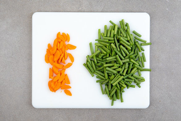 Die Enden der Bohnen abschneiden und die Bohnen in ca. 2cm lange Stücke schneiden. Die Karotten schälen, längs halbieren und in dünne Scheiben schneiden.