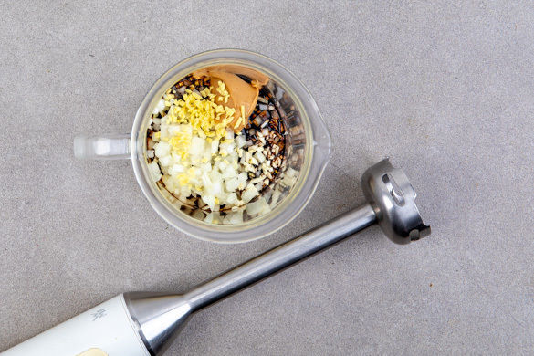 Die Zwiebeln, den Knoblauch und den Ingwer mit dem Ketjap Manis und der Erdnussbutter in einem hohen Gefäß mit einem Stabmixer glatt pürieren.