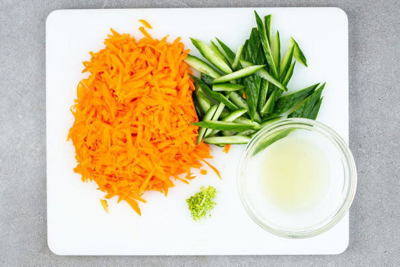 Die Karotten schälen und mit einer Küchenreibe grob raspeln. Die Gurke längs vierteln, das Kerngehäuse mit einem Löffel auskratzen und Gurke schräg in dünne Streifen schneiden. Die Limettenschale abreiben, dann die Limette halbieren und auspressen.