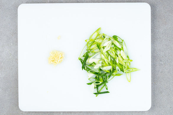 Die Lauchzwiebeln schräg in feine Ringe schneiden. Den Knoblauch schälen und fein reiben oder sehr fein würfeln.