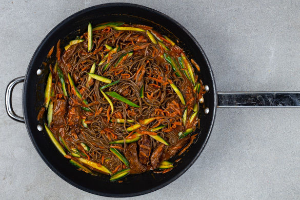 Unkompliziert in der Zubereitung und ein wunderbarer Kurztrip in die vielfältige Küche Asiens: Die saftige Nudelpfanne mit feinen Sobanudeln, zartem Rindergeschnetzeltem, knackigem Gemüse und einer würzig-pikanten Teriyaki-Erdnuss-Sauce ist das perfekte Feierabend-Dinner für dich und deine Lieben!