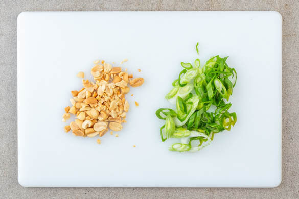 Die Lauchzwiebel in feine Ringe schneiden. Den Brokkoli und die Karotten mit dem Curry vermengen und aufwärmen lassen. Abschmecken und ggf. mit mehr Salz und Pfeffer würzen. Die Erdnüsse grob hacken. Das Curry auf dem Reis anrichten und mit den Lauchzwiebeln und den Erdnüssen garniert servieren.