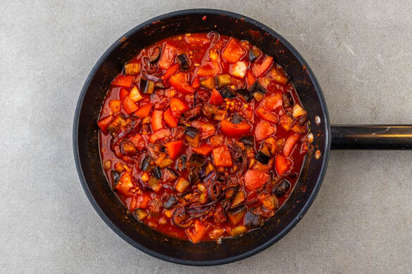 Die Zwiebel schälen und in feine Ringe schneiden. Den Knoblauch schälen und in feine Scheibchen schneiden. Die Aubergine in 1–2cm große Würfel schneiden. Das Gemüse in einer großen Pfanne mit 1½EL Olivenöl und je 1 Prise Salz und Pfeffer bei mittlerer Hitze in ca. 5Min. leicht gebräunt anbraten. Dann 3EL Wasser zugeben und abgedeckt 4–6Min. garen, bis die Aubergine weich ist.