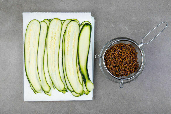 Den Backofen auf 220°C (200°C Umluft) vorheizen. Die Zucchini der Länge nach in dünne Scheiben schneiden. Auf ein Geschirrtuch oder etwas Küchenkrepp legen, mit 1 Prise Salz bestreuen und beiseitestellen. Die Linsen in einem Sieb abtropfen lassen.